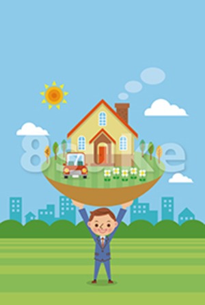 マイホームを支えるビジネスマンのイメージを背景ありで書きました。かわいい人物イラスト素材です。